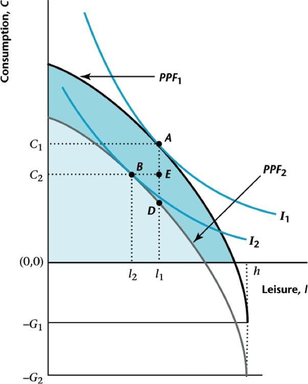 Pure income effect $\rightarrow$ both $c$ and $\ell$ fall