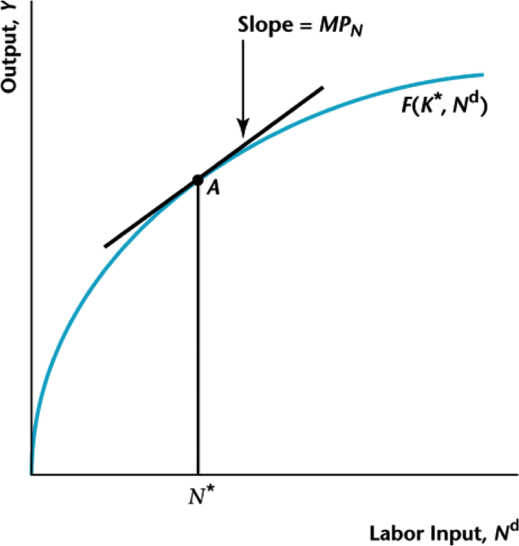 The firm hires workers until the marginal product of an additional work is equal to the wage