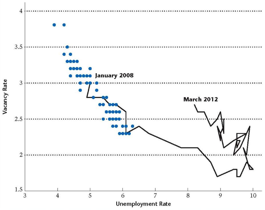 - We can observe this in the relationship between the unemployment rate $u$ and the vacancy rate $v$