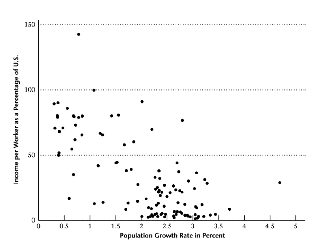 Third, it predicts that countries with higher population growth will have lower income per worker (✓)