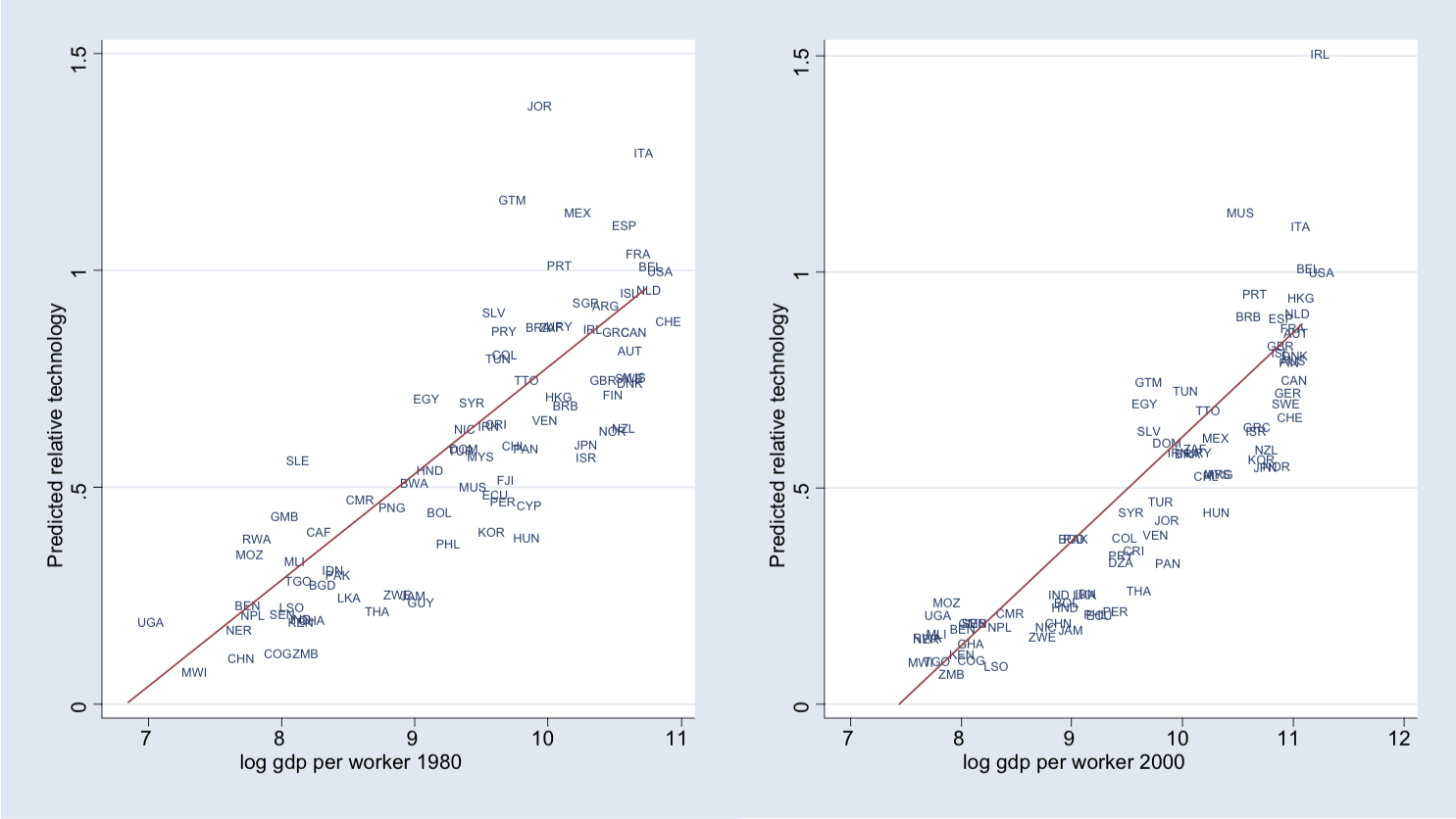 - Countries below the red line have relatively low overall productivity, but make up for it with high levels of capital (physical or human)