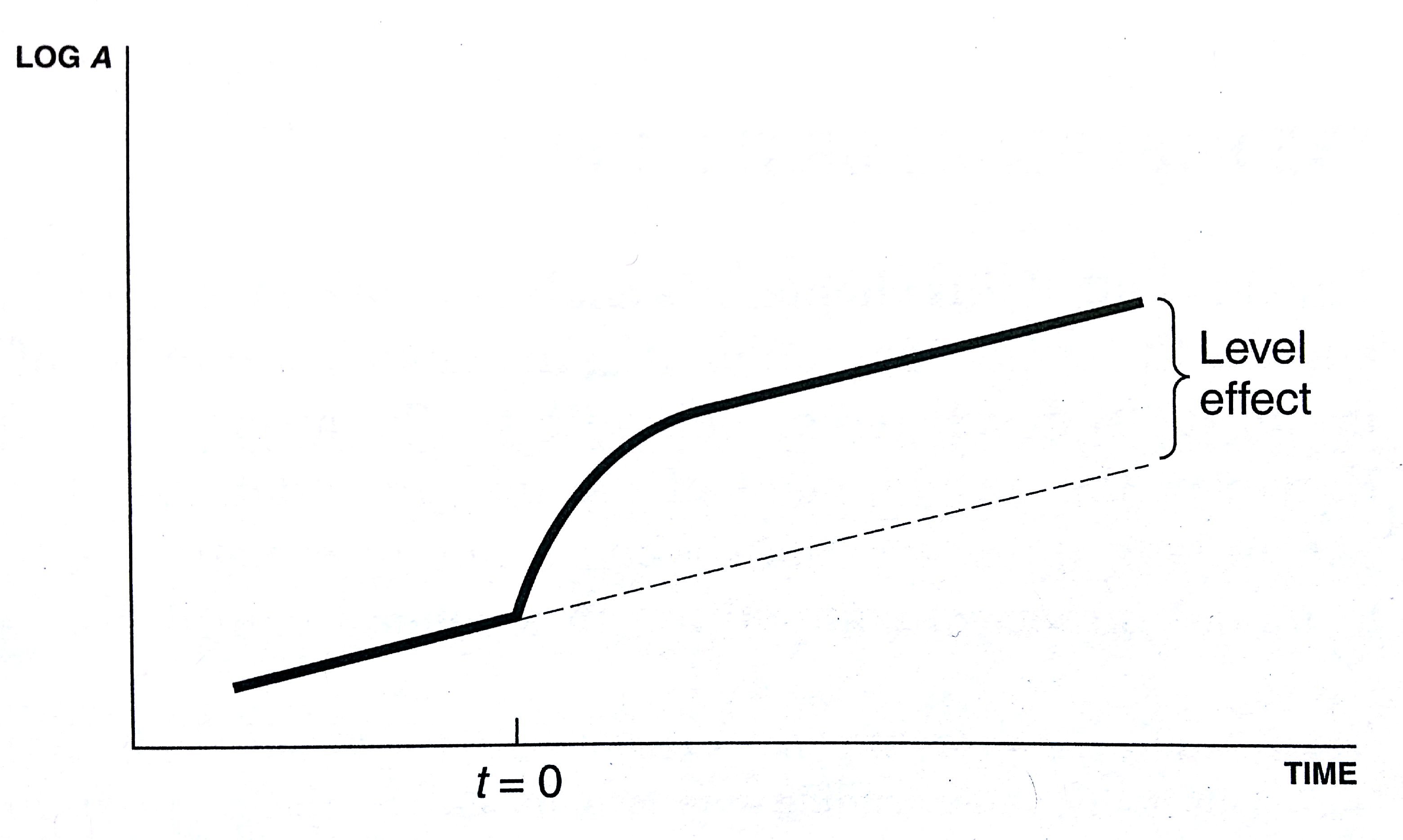 - Initially, the growth rate $g_A$ will jump up — over time this will make $A$ increase at a faster rate